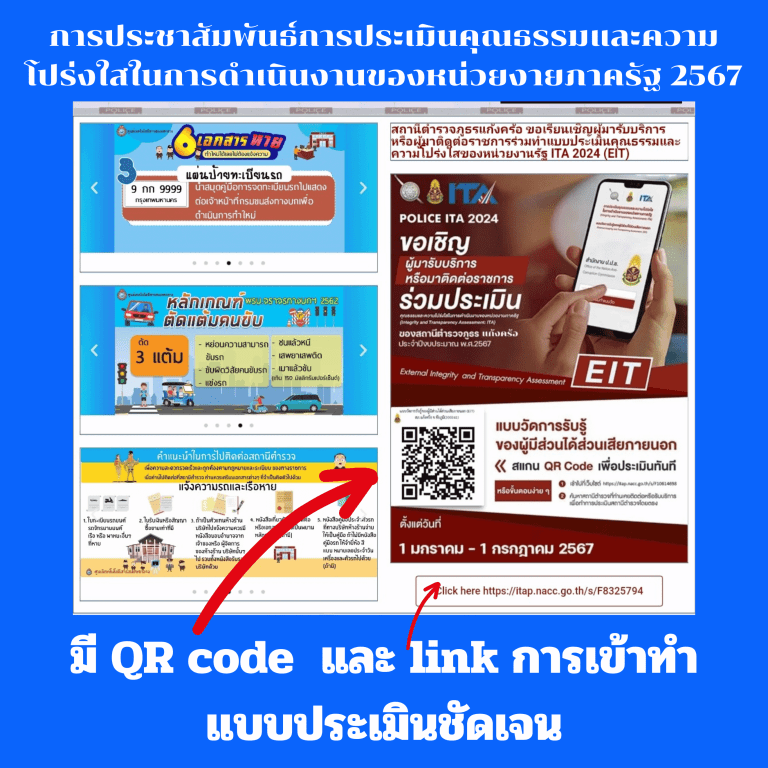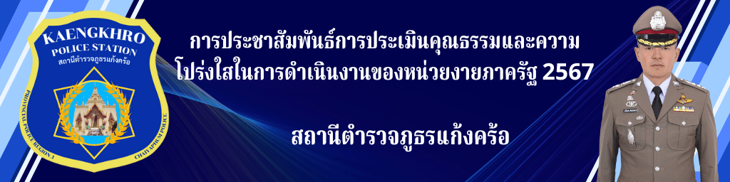 สถานีตำรวจภูธรแก้งคร้อ ขอเรียนเชิญผู้มารับบริการหรือผู้มาติดต่อราชการร่วมทำแบบประเมินคุณธรรมและความโปร่งใสของหน่วยงานรัฐ ITA 2024 (EIT)