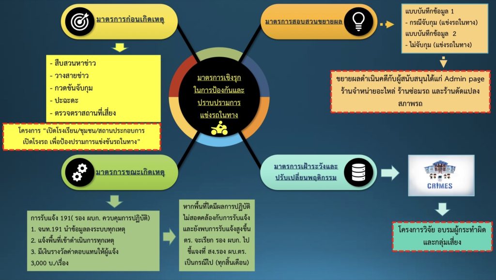 และ 4.มาตรการเฝ้าระวังและปรับเปลี่ยนพฤติกรรม - บันทึกข้อมูลกลุ่มเสี่ยงต่อการแข่งรถในทางในทุกพื้นที่ทั่วประเทศ ไว้ในระบบ CRIME อย่างเป็นระบบ