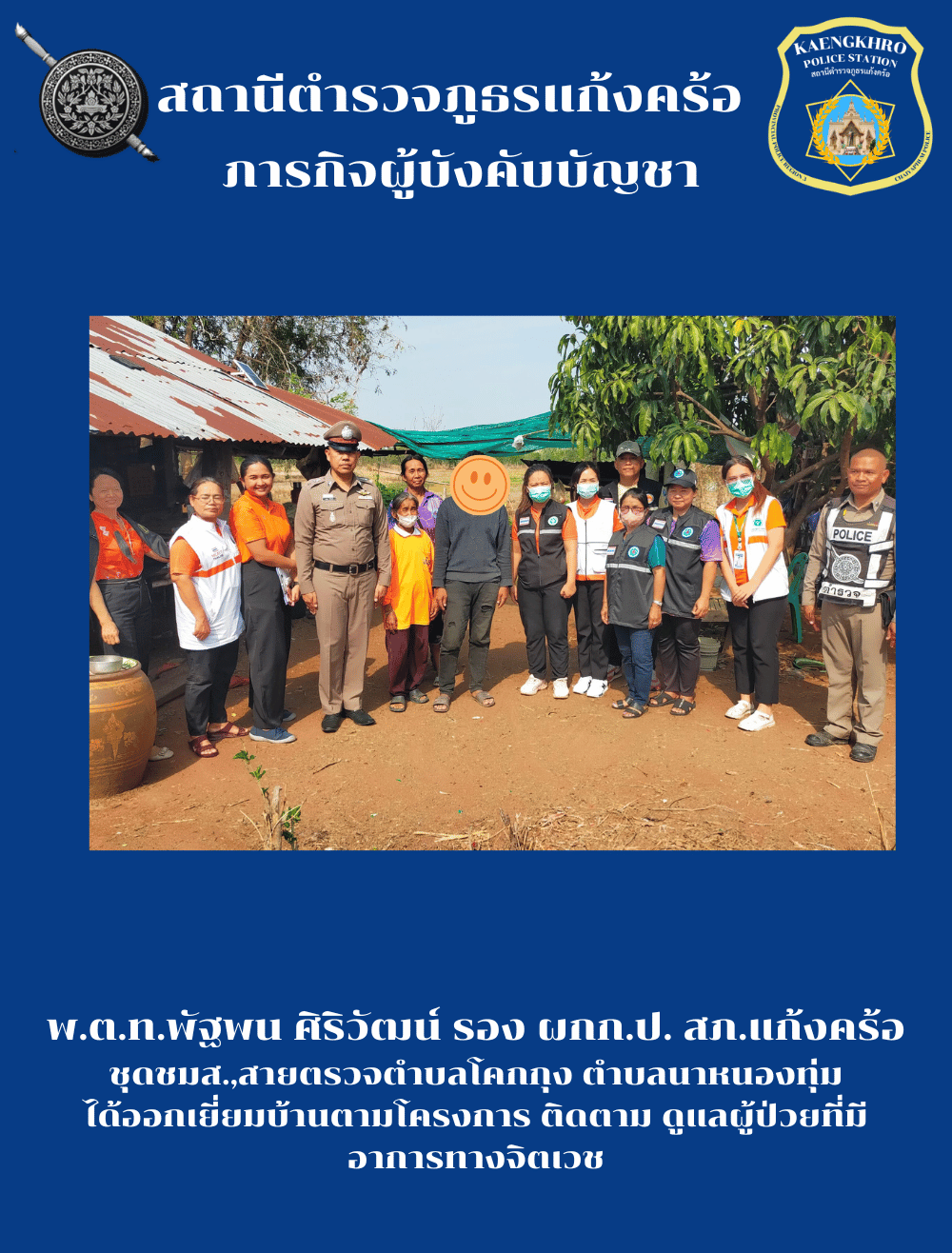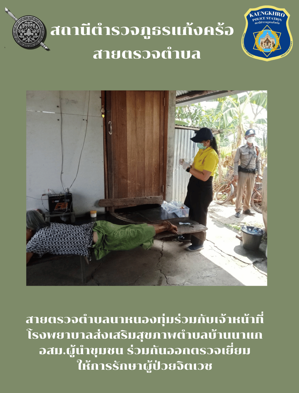 สายตรวจตำบลนาหนองทุ่มร่วมกับเจ้าหน้าที่ โรงพยาบาลส่งเสริมสุขภาพตำบลบ้านนาแก อสม.ผู้นำขุมชน ร่วมกันออกตรวจเยี่ยม และรักษาความปลอดภัยให้แก่คณะ ในการตรวจเยี่ยม ให้การรักษาและให้คำปรึกษาด้านสุขภาพ แก่ครอบครัว ที่มีอาการป่วยจิตเวช