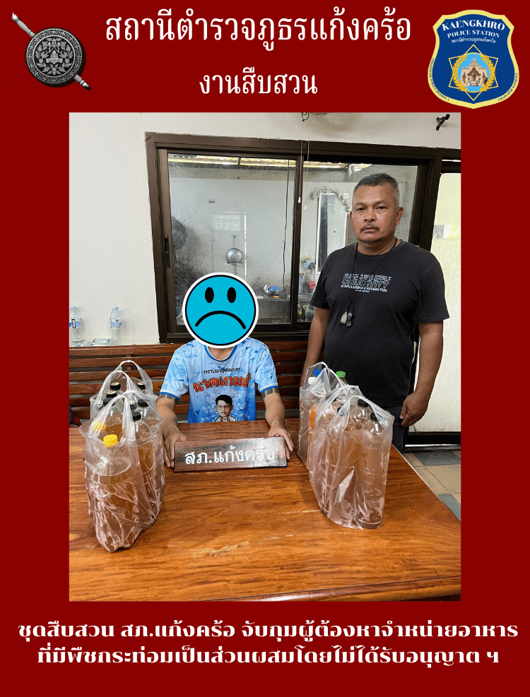 ชุดสืบสวน สภ.แก้งคร้อ จับกุมผู้ต้องหาจำหน่ายอาหารที่มีพืชกระท่อมเป็นส่วนผสมโดยไม่ได้รับอนุญาต ฯ