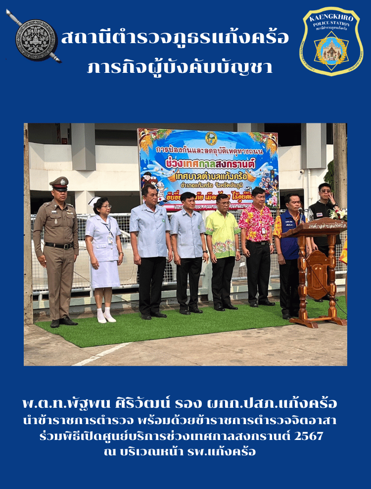 พ.ต.ท.พัฐพน ศิริวัฒน์ รอง ผกก.ป.สภ.แก้งคร้อ นำข้าราชการตำรวจ พร้อมด้วยข้าราชการตำรวจจิตอาสา ร่วมพิธีเปิดศูนย์บริการช่วงเทศกาลสงกรานต์ 2567 ณ บริเวณหน้า รพ.แก้งคร้อ