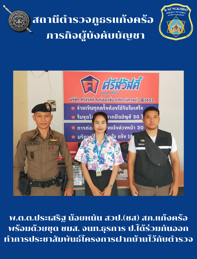 พ.ต.ต.ประเสริฐ น้อยหนัน สวป(ชส) พร้อมด้วยชุด ชมส. จนท.ธุรการ ป.ได้ร่วมกันออกทำการประชาสัมพันธ์โครงการฝากบ้านไว้กับตำรวจ